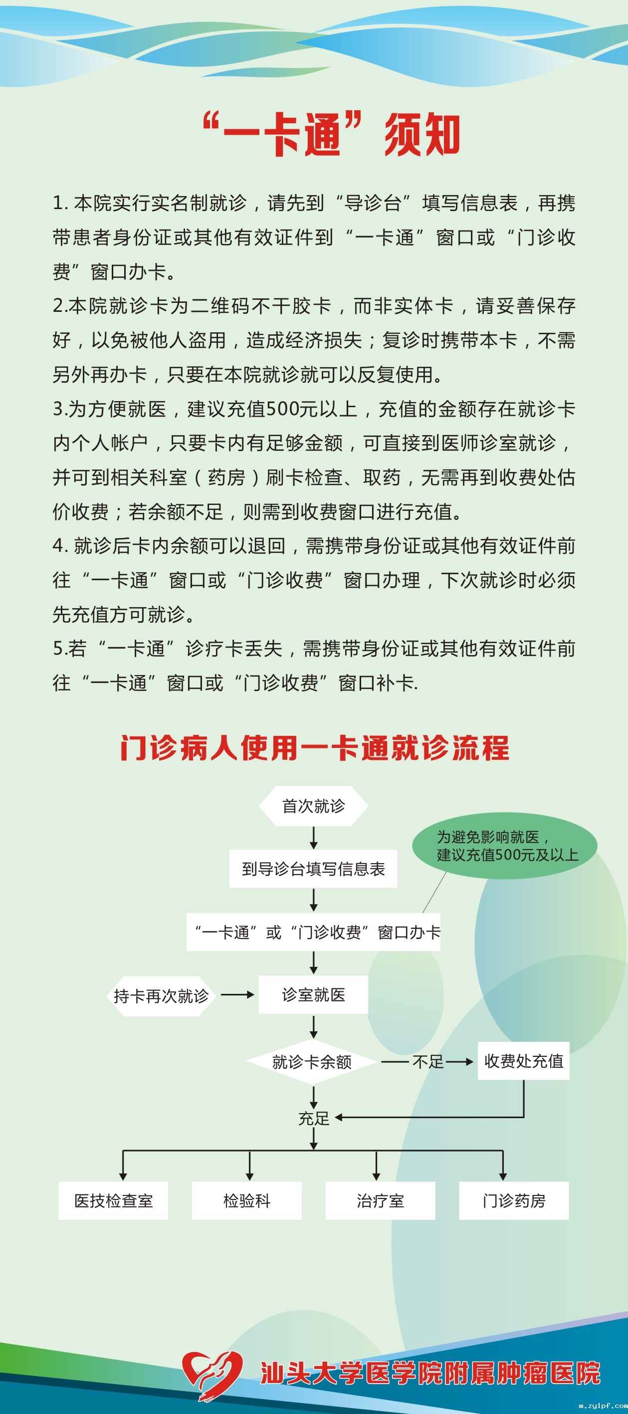 我院自2019年3月29日零时起启用门诊新系统并实行实名制就诊,届时所有就诊患者须携带本人身份证(或户口本)及医保卡按以下流程进行: 1、 至一楼门诊大厅导医台填写个人信息表; 2、 至收费窗口办理就诊卡及充值(建议充值500元以上); 3、 至各诊室就医。 肿瘤医院门诊部