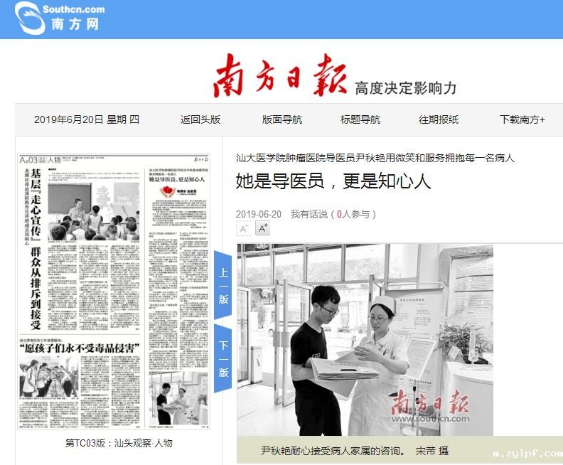 在为患者提供服务的同时,尹秋艳也获得了满满的职业成就感。“你别小看我呢,有时候去菜市场买菜,或者逛超市,又或者逛街,总是有人主动跟我打招呼,‘我认识你,你是肿瘤医院的导医员。’”尹秋艳表示,“其实,可能我就只给对方递了一杯水,或者一张纸巾,他们就记住我了。患者要的真的不多。” 原文链接:http://epaper.southcn.com/nfdaily/html/2019-06/20/content_7806142.htm |