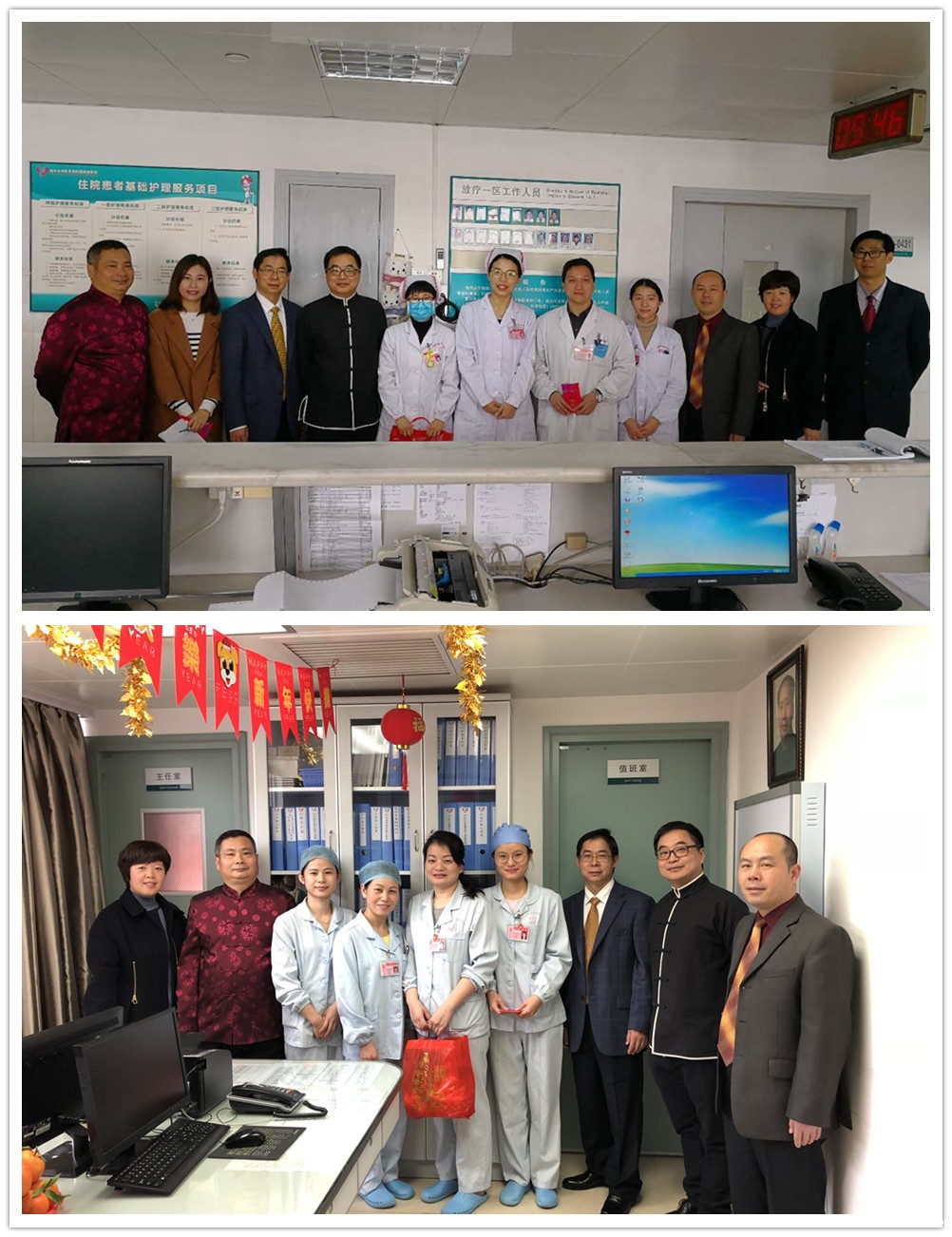 2月16日上午,农历正月初一,阳光明媚,我院姚锡涛书记、林志雄副院长、林英城副书记、邱卫黎副院长、韩冬青总会计师携院办工作人员亲切慰问了坚守在工作岗位上的一线医护、后勤工作人员,为他们送上慰问品,并致以最美好的祝愿,祝大家新春愉快,身体健康,阖家幸福。 走访过程中,院领导询问了各病区的患者住院情况及各科室的运转情况,并与值班人员亲切交谈。院领导对一线人员为医院发展做出的奉献表示肯定,勉励大家节日期间继续坚守岗位,确保医疗和生产安全,确保各项工作正常运转,一如既往地为患者提供优质的医疗服务,度过一个平安祥和的新春佳节。真诚的慰问,温暖的祝福,每个工作人员的脸上都洋溢着幸福的微笑,各病区呈现出温馨、和谐的氛围。在岗工作人员感谢院领导的关心与祝福,他们表示今后将继续立足岗位,全力支持医院的工作,积极为肿瘤医院的发展做贡献。 (通讯员:陈泓琳)