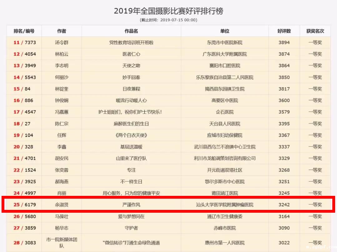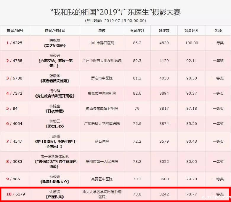 由广东省卫生健康委、广东省中医药局举办的“我和我的祖国”——2019年“广东医生”摄影大赛于2019年7月14日圆满结束。“广东医生”摄影大赛作为广东省卫生健康系统“广东医生家国情”系列主题活动的重要内容之一,自5月启动以来,有来自21个地市1165位作者共同参与,收集了2531组共4449张反映卫生健康系统工作点点滴滴的优秀作品。经过专家评审及大众评选,我院ICU余淑贤护士长的作品《严谨作风》在众多作品中脱颖而出,荣获“我和我的祖国”2019“广东医生”摄影大赛综合评分一等奖,该作品同时被推荐参加“2019年全国卫生健康系统纪实摄影大赛”并获得大众评选一等奖;黄继红主任的作品《守护》获得大赛优秀奖,为医院赢得荣誉。