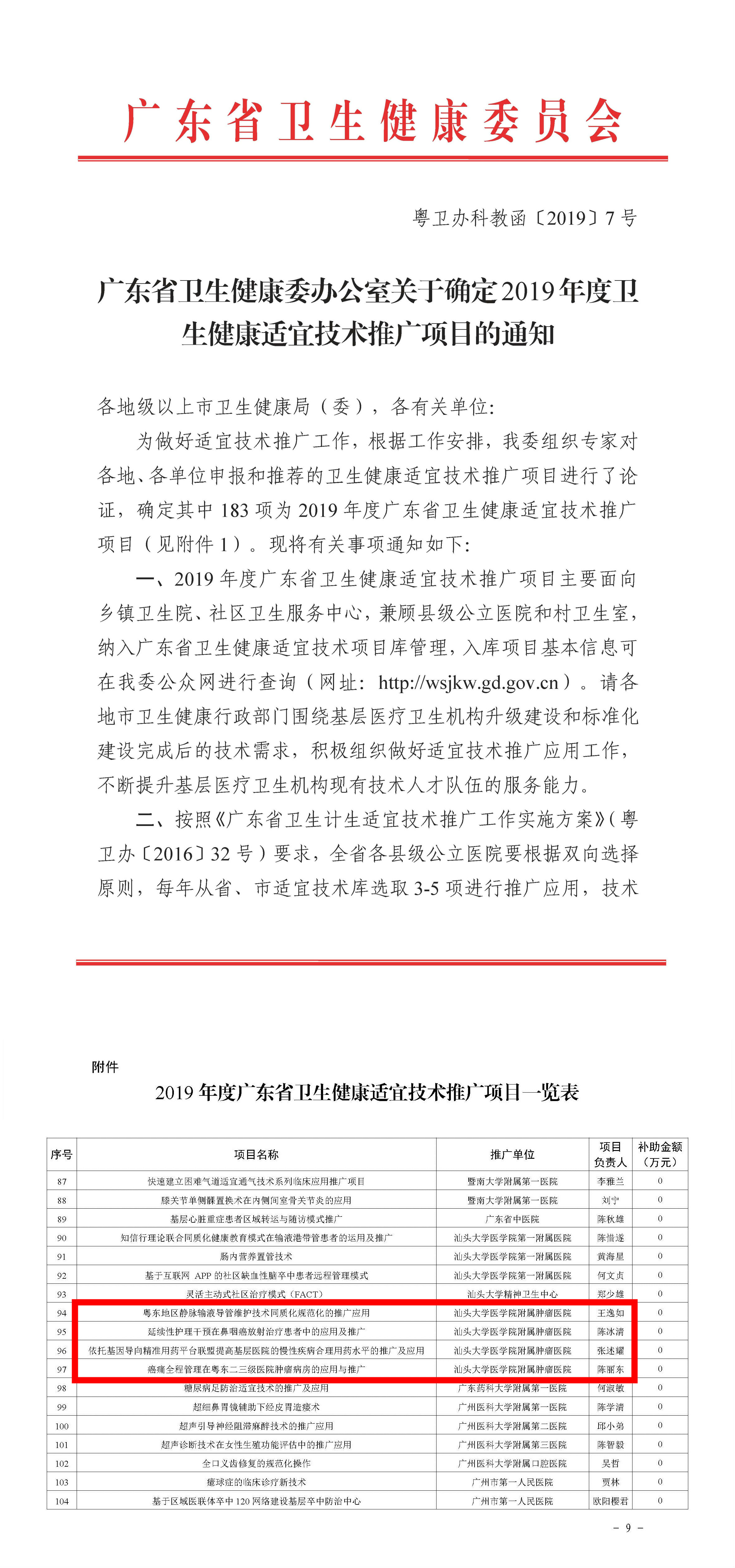 据广东省卫生健康委办公室8月15日发布的《关于确定2019年度卫生健康适宜技术推广项目的通知》所示,我院今年申报的四个项目全部立项。 本次立项的四个项目《依托基因导向精准用药平台联盟提高基层医院慢性疾病合理用药水平的推广及应用》、《延续性护理干预在鼻咽癌放射治疗患者中的应用及推广》、《癌痛全程管理在粤东二三级医院肿瘤病房的应用与推广》和《粤东地区静脉输液导管维护技术同质化规范化的推广应用》分别涉及精准用药、延续护理、静脉输液导管维护技术培训推广及癌痛管理等,各个项目在前期开展过程中已积累了丰富的临床和培训经验,也都取得不错的临床成效,适合在基层医疗机构进行开展与推广,响应了卫生部关于“加强卫生与健康成果转移转化工作”的指导思想。比如,《延续性护理干预在鼻咽癌放射治疗患者中的应用及推广》项目独具专科特色,采用健康教育图、病友联谊会与微信平台进行推广进行的方式,是一种耗材少,成本低,简便、安全的延续性护理干预;而关于癌痛全程管理的项目,依托的科室为广东省首批“癌痛规范化治疗示范病房”,场地培训条件优势明显,且在培训师资、技术等方面均具有多年的临床经验及教学经验,能对二三级医护人员和患者存在的问题进行针对性培训及到基层应用单位做技术指导,从而提高疼痛科基层医务人员对疼痛的重视程度和对癌痛知识的知晓程度,降低患者疼痛程度、提高患者口服止痛药的依从性和提高生活质量等。 此次健康适宜技术推广项目获批,是省卫健委对本院开展的项目的肯定,希冀获批的项目能如期完成在基层进行推广的目标,也希冀我院能有更多的适宜技术进行推广,把健康教育从“普及卫生知识”延伸到“自愿采取有利于健康的行为和生活方式”上来,促进人民群众生活质量的提高。 (通讯员:刘宏芝)