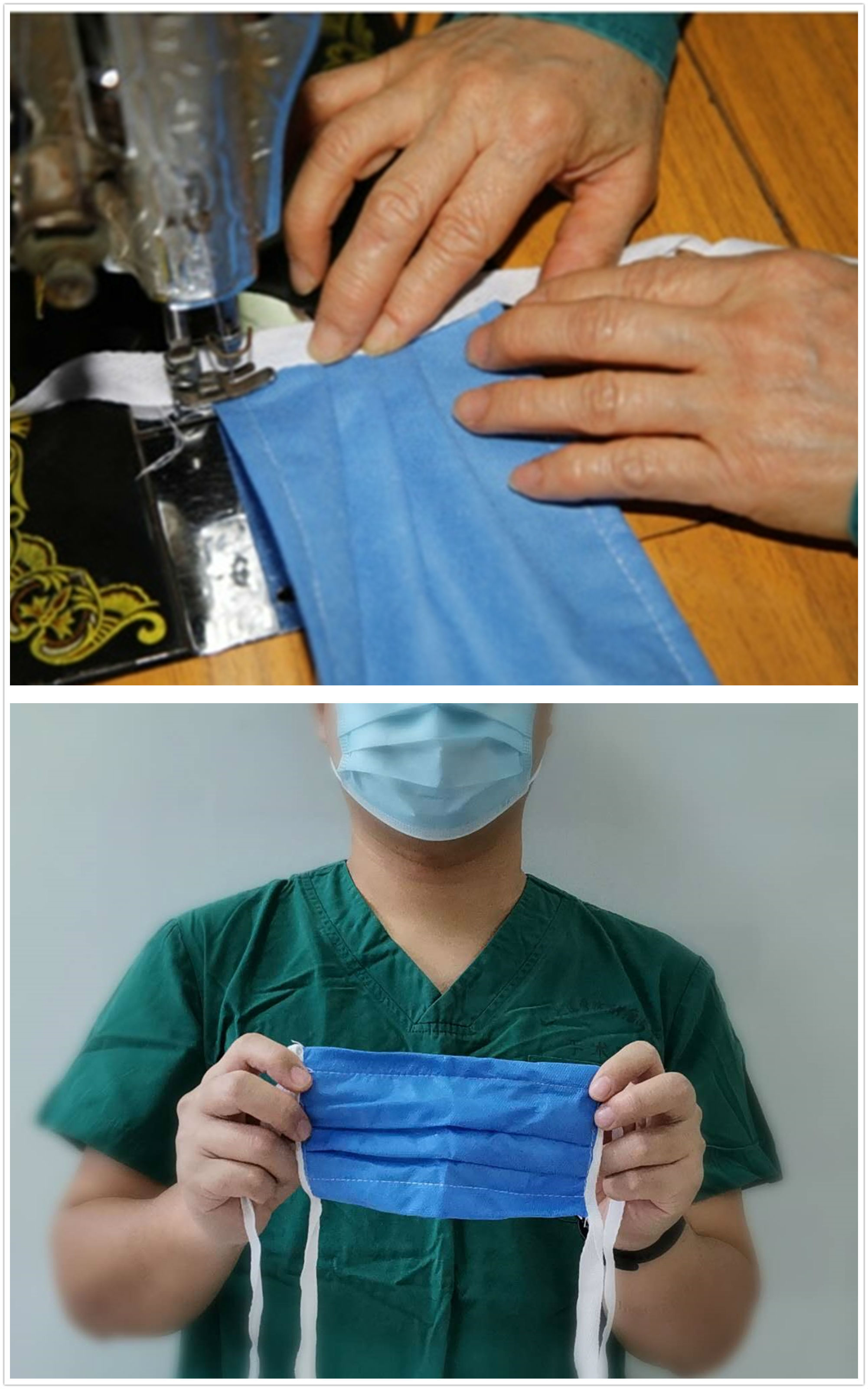 响应我院节约医用资源需要,自制口罩供应需求 1月28日,疫情之下一次性医用口罩紧张。为了尽量节省资源,让更多资源留给一线医护人员,科室自制缝制纱布口罩200个,提供给静配中心,用于护理人员配制药物时使用。据使用统计,可减少该科室全日原一次性口罩使用量的30%,另科室还制作一次性无纺布口罩,可满足自己科室日常非临床场景下使用。自制口罩使用的无纺布是器械打包的无纺布,这种无纺布由三层结构组成:S层、M层、S层,其中M层有阻菌作用。为了方便佩戴和更加舒适,自制口罩最里面还加了双层纱布。材料成本约0.8元,制作用时12分钟,所有自制口罩需高压灭菌消毒。
