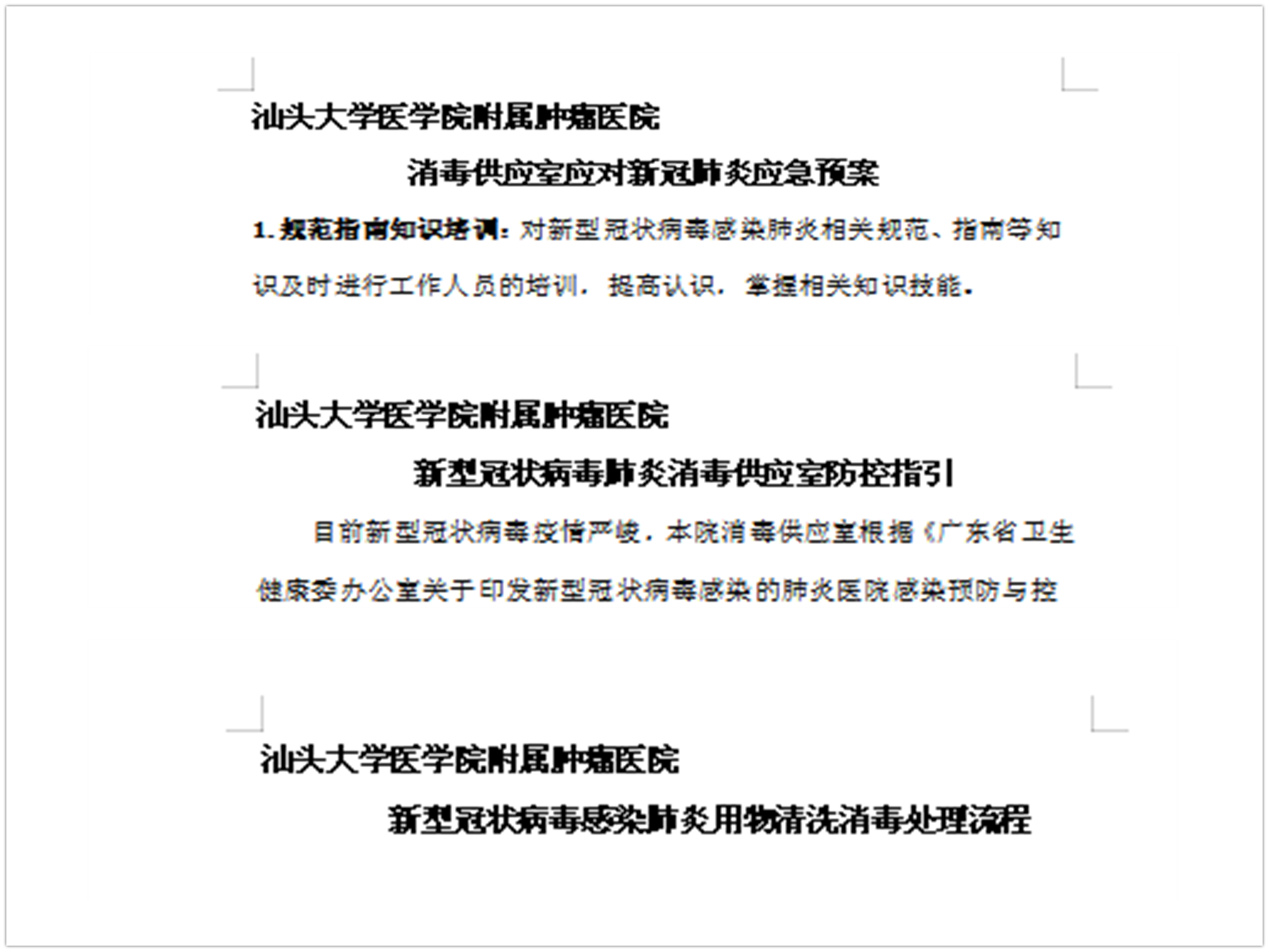 强培训重管理,切实做好防控工作 科室积极响应我院关于加强人员培训的要求,组织科室人员通过网络平台加强培训新冠肺炎相关知识、及时传达上级下达的各项文件、培训考核工作人员穿脱隔离衣。依据广东省卫健委办公室的相关文件规定,结合消毒供应室的工作要点,迅速制定本科室的《新冠肺炎消毒供应室应急预案》、《新冠肺炎消毒供应室防控指引》及《可复用医疗器械具和物品清洗消毒处置流程》等。通过制定工作流程,明确标准,加强细节管理,提高科室人员对新冠肺炎的防控水平和应对能力,切实做好各项防控工作。