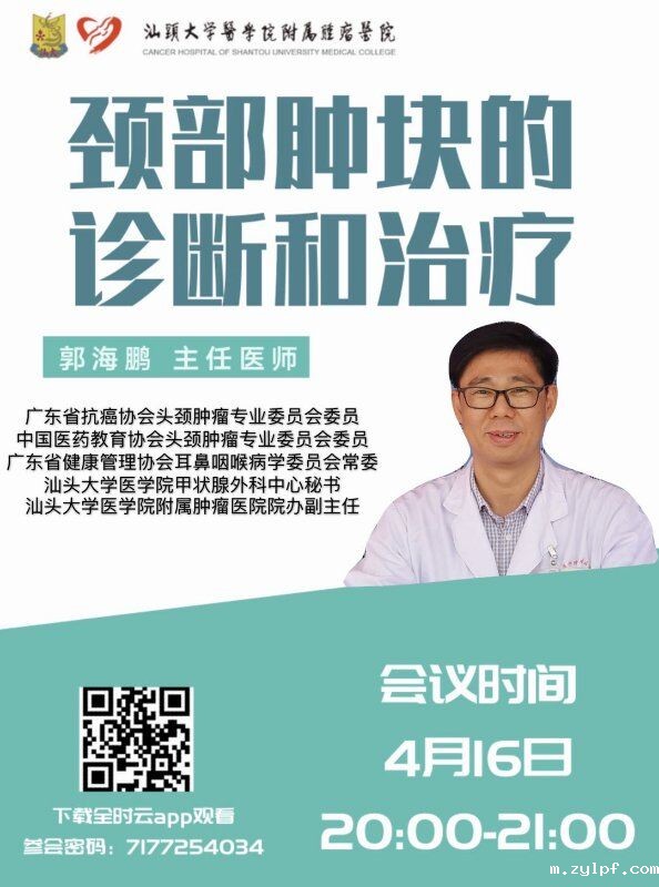 题目:颈部肿块的鉴别诊断与治疗 时间:4月16日(星期四)20:00-21:00 主讲人:郭海鹏 主任医师