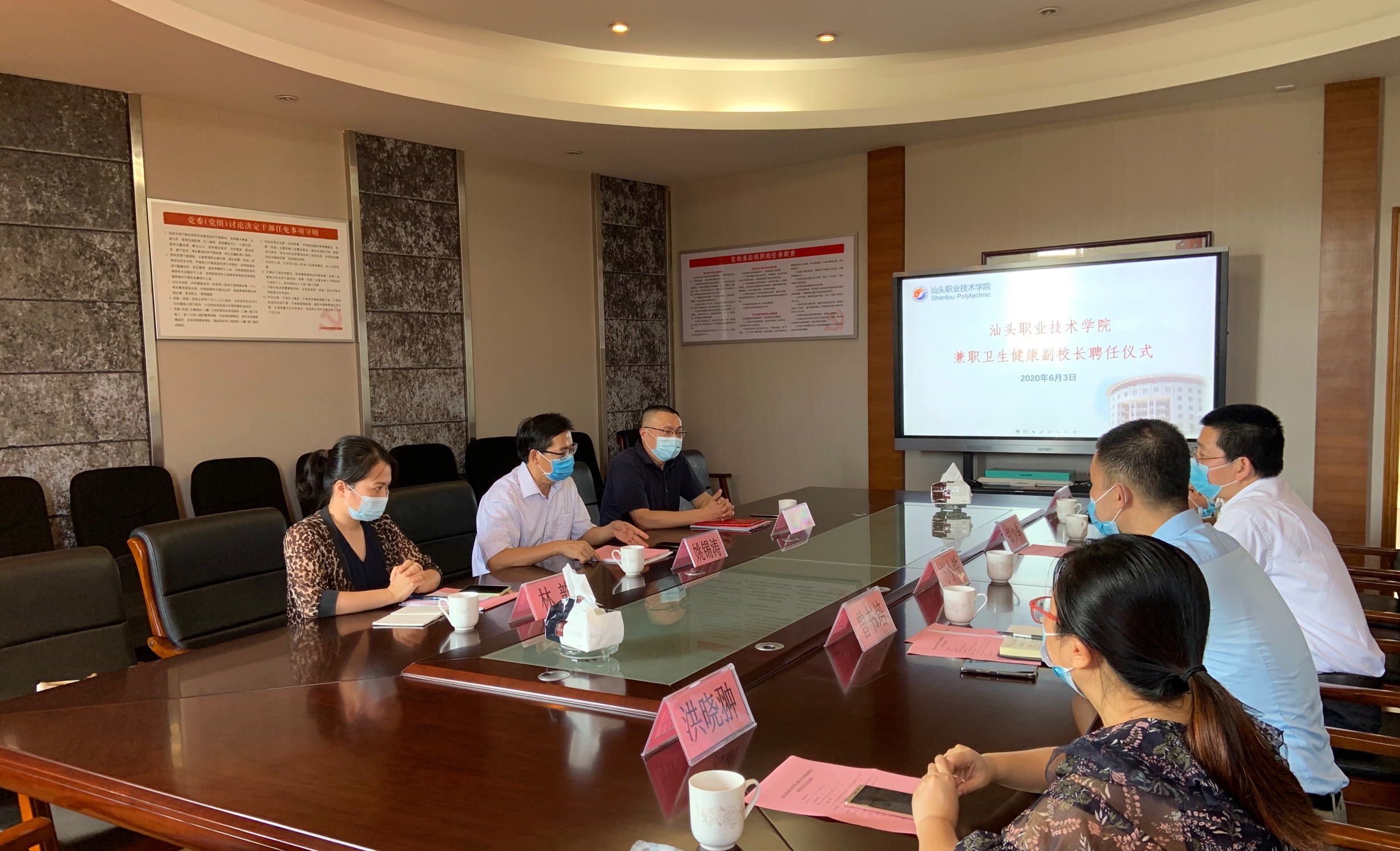 6月3日下午,我院党委书记姚锡涛书记带队一行,到汕头职业技术学院参加该校兼职卫生健康副校长聘任签约仪式,与该校党委副书记方小铁、学院办公室主任曾书培等做交接工作。 为贯彻落实《广东省卫生健康委广东省教育厅关于规范兼职卫生健康副校长管理工作的通知》精神,经市卫生健康局和市教育局联合审定,我院医疗质量管理科副科长翁鸿锐同志受聘为汕职院兼职卫生健康副校长,放疗科主管护师林韵同志驻校指导和协助校医所开展疫情防控工作。 会上,姚书记发言表示,目前,新冠肺炎疫情处于常态化防控阶段,我们仍要时刻绷紧这根弦,不能有松懈情绪,按照省卫生健康委、省教育厅的工作部署和要求,我院愿意全力支持协助学校做好校园疫情防控及卫生工作,为保障学校师生员工生命安全和身体健康尽我们的一份力。 面对汕职院一万多名学生即将来临的复学期间疫情防控压力,来自我院的医疗前线的翁鸿锐同志及林韵同志表示将发挥专业医疗卫生素养,配合学校实际情况及时开展各项疫情防控、卫生突发事件处理及健康卫生知识宣教工作。 会后,在汕职院领导的陪同下,姚书记一行参观了汕职院校园环境及卫生支持系统。