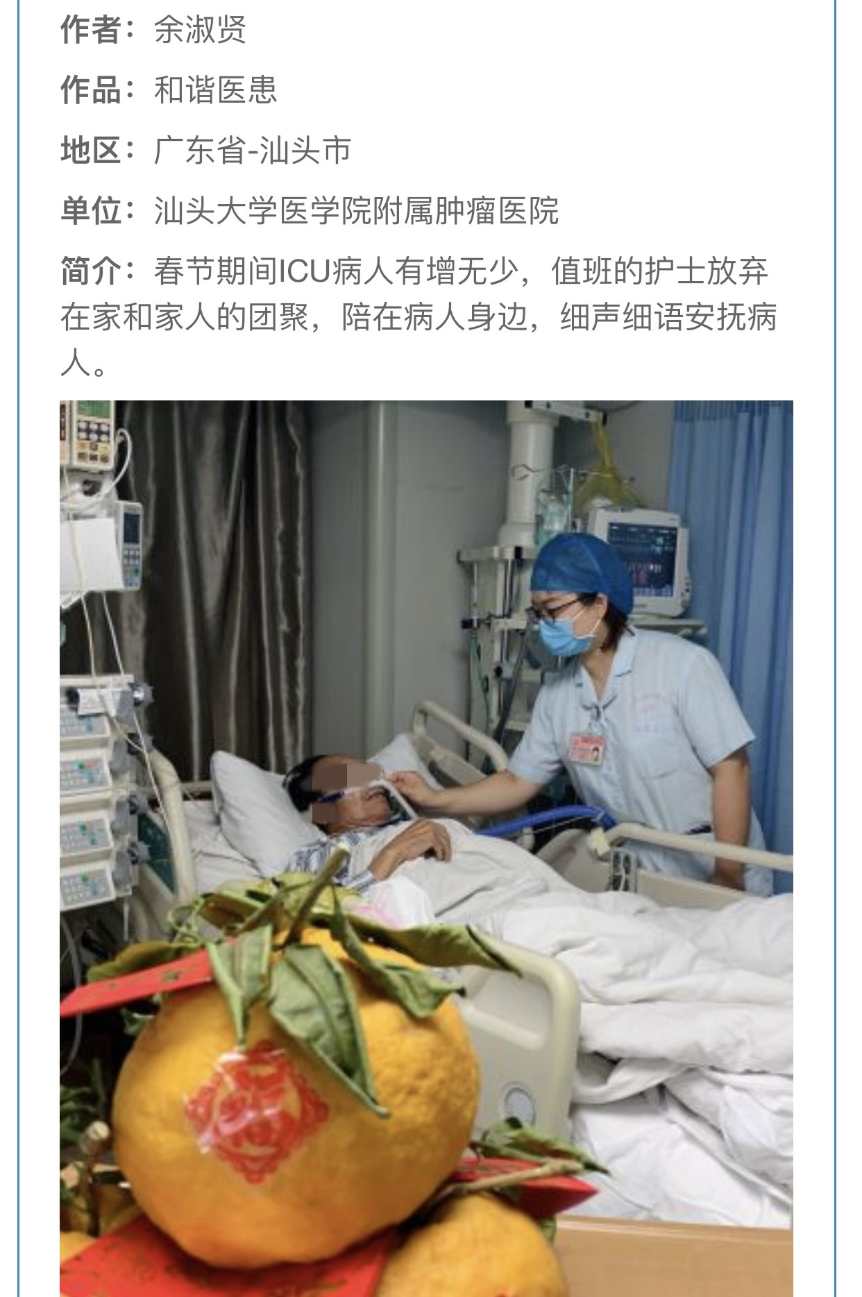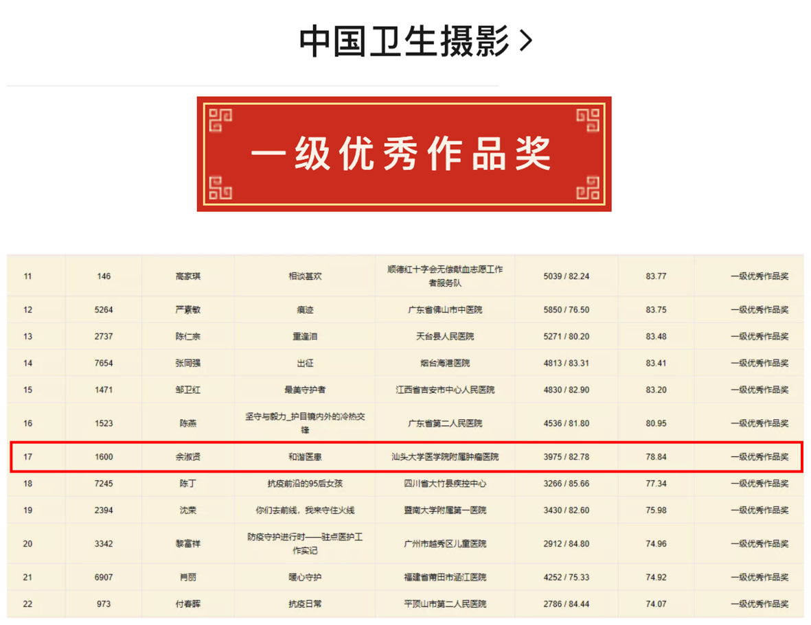 8月17日,由中国卫生摄影协会主办、中国卫生摄影协会新媒体传播分会承办的2020年全国卫生健康系统“战疫”纪实摄影大赛圆满谢幕。经过激烈角逐,我院ICU余淑贤护士长的作品《和谐医患》在众多作品中脱颖而出,获得一级优秀作品奖,为医院赢得了荣誉。 本次大赛自2019年12月启动“中国年味”主题征稿,2020年初为传播抗疫精神,弘扬医护美德,协会将大赛主题升级为“众志成城,抗击疫情”。经过半年多的征集,共有全国31个省区277市共2568位作者参加了本次赛事,经审核通过的投稿作品共7486幅(组),照片14671张,全程采用线上投稿、媒体征集、专家评审、大众评选等环节。 《和谐医患》作品记录了春节期间,在肿瘤医院ICU里,值班护士放弃和家人团聚,陪伴在病人身边,轻声细语安抚病人的故事,以影像形式定格了守护生命、医患和谐的美好瞬间,传递满满正能量。