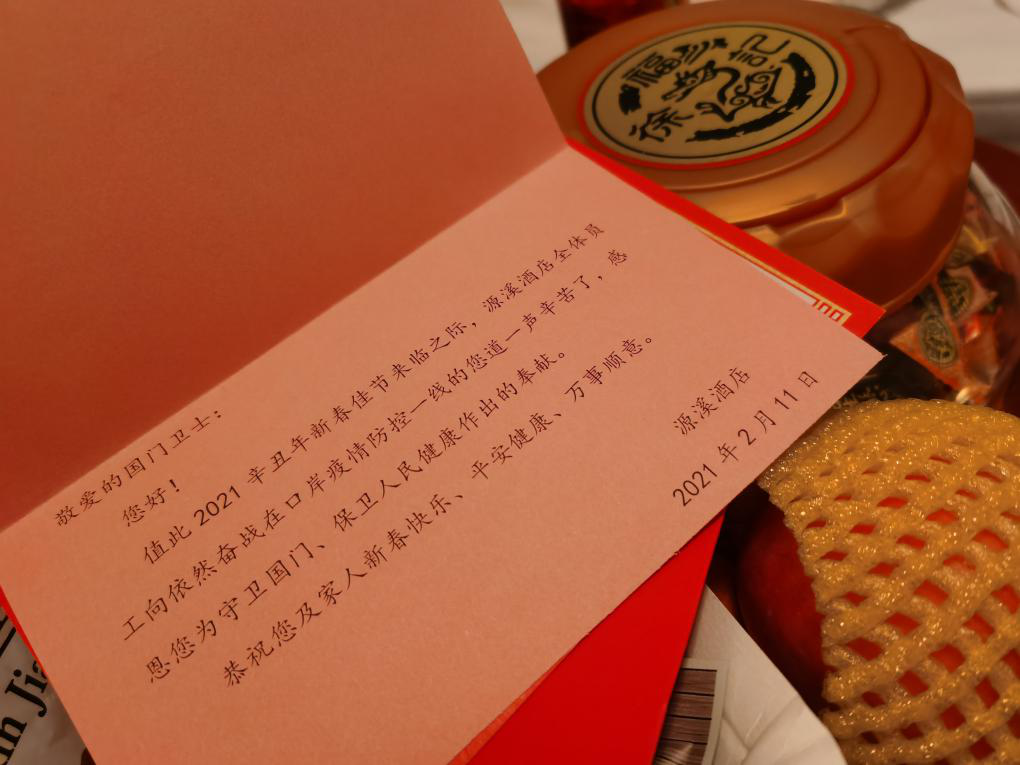 白驹过隙,一眨眼2020年伴随着新年的钟声,悠扬而去。一场突如其来的新冠疫情,使我们原本的生活发生了变化:出门戴口罩,人群勿扎堆;就连春节也变了,一改往日的大型春运,倡导人们就地过年。 春节是我最期待的节日,既能收红包,又能放鞭炮、看烟花。然而今年的春节与往年大有不同,我作为一名医务人员,前往广州白云海关机场支援采样工作,也因此度过了一个别样的春节。与家人分离虽心有不舍,但转念一想,家是最小国,国是千万家,只有坚守住国门这个大家,才能守住千千万万的小家。 常说身在他乡过年年味淡,淡如水,而我却在他乡过年感受到了浓浓的年味。节日当天汕头市卫健委、院领导通过视频会议,为我们送来满满一波的新春祝福。此外还有那一件件从远处寄来的物资,一份份充满暖暖情意的特产。犹如父亲母亲般,即使相隔千里,却仍旧是我们最坚强的后盾! 另一边,海关酒店也彰显出十足的人文关怀。精心装扮的大灯笼、小彩灯渲染出节日气氛;用心烹饪的牛肉丸,香喷喷的沙茶牛肉勾起潮汕年味;更有贴心零食大礼包与一封充满沉甸甸温情的祝福信。在大年三十晚上,与队友们“抱团取暖”,看看春晚、唠唠家常、品品功夫茶。如此想来,虽是别样的春节,但仍旧能感受到一样的温情。 辛丑牛年,家国同心,他乡亦故乡,温暖一样在。