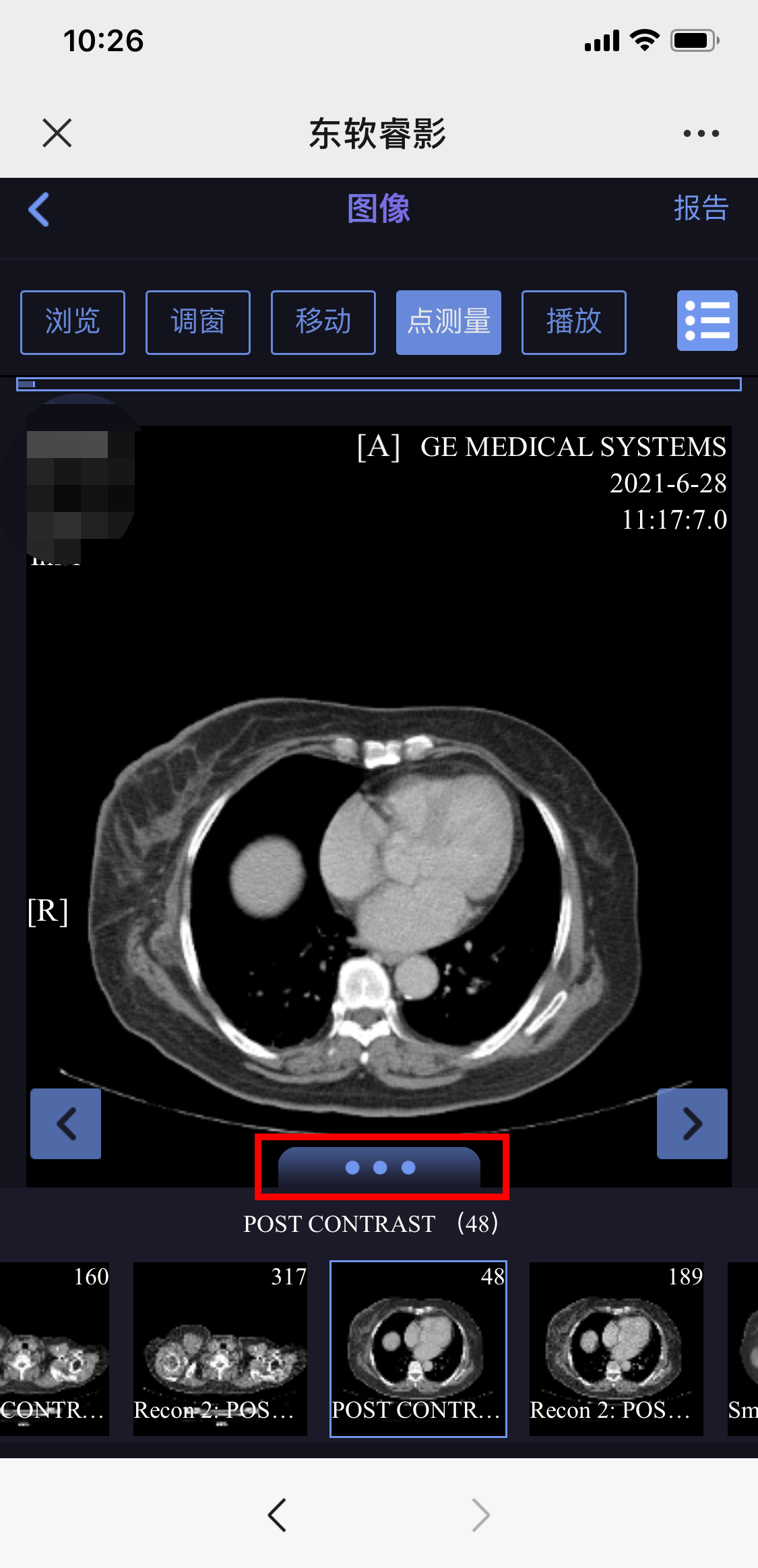 2.读、取云胶片: 使用手机微信扫描报告左上角的二维码,按提示输入姓名、手机号码,获取云胶片(电子胶片),点击图像下方的三个圆点可以选择不同系列浏览。
