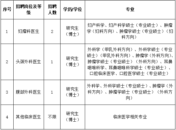 是粤东地区唯一一所集预防、医疗、教学和科研为一体的非营利性三级肿瘤专科医院。在省、市各级领导的关心支持和李嘉诚先生的鼎力资助下,医院于1994年11月28日正式成立并得到快速发展。全院职工共714人,高中级职称407人,博、硕士学历192人。医院现有病床704张,设有放疗科、胸部外科、乳腺外科、腹部外科、头颈外科、妇瘤科、中西结合科、呼吸肿瘤内科、消化肿瘤内科、乳腺肿瘤内科、淋巴瘤与血液肿瘤内科、生物治疗科、泌尿外科、介入治疗科、家庭病床科、重症监护室、核医学科等30多个临床和医技科室。开展各种肿瘤的规范化综合治疗和研究,取得良好的效果。乳腺癌、鼻咽癌、食管癌等潮汕高发常见的肿瘤疗效达国内先进水平,医疗技术水平在粤东地区享有盛誉,已成为粤东地区的肿瘤防治中心。 1996年食管外科被评定为汕头市“4115科教兴医”重点专科,2005年医院成为国家药物临床试验机构。肿瘤学荣获广东省“十二五”医学重点学科和第九轮广东省优势重点学科,拥有省内唯一的 “广东省乳腺癌诊治研究重点实验室”,内科为广东省首批“癌痛规范化治疗示范病房”,肿瘤科和胸外科获广东省临床重点学科。2003 年成为肿瘤学硕士学位授权点,2012年成为汕头大学医学院二级学科肿瘤临床医学博士点和博士后流动站。设立广东省食管癌研究汕头分中心、汕头大学医学院甲状腺外科研究中心及汕头大学医学院临床药学研究中心。 作为一所定位为国际化研究型肿瘤防治中心的肿瘤专科医院,医院一直重视国际交流和学习。医院长期与斯坦福大学、剑桥大学、波恩大学、密歇根大学、香港大学、香港中文大学、香港理工大学等国际一流的高等院校和肿瘤研究中心保持紧密联系与合作,以食管癌、鼻咽癌、乳腺癌为重点,积极开展国际性、多中心、前瞻性的临床试验和科研合作。 医院积极拓宽出国出境访问学习途径,支持、选派业务骨干出国进修、访问及学术交流。定期选派医师到美国斯坦福大学癌症中心、美国纽约Memorial Sloan-Kettering 癌症中心、香港中文大学威尔斯亲王医院、加利福尼亚大学旧金山分校、澳大利亚墨尔本大学学习进修。同时,邀请国外知名专家到医院开展学术交流,不断引进新技术、新理念,为提高肿瘤诊治水平起到了积极的促进作用。 在汕头市委、市政府及李嘉诚基金会的鼎力支持下,我院获得易地升级重建建设用地150亩,座落于汕头大学对面的汕大智慧城。医院易地重建项目(一期)已于2019年9月正式启动,计划2022年底竣工。新医院将以高起点、前瞻性、有特色、国际化的视野进行整体规划,拥有床位1500张,具备PET-CT、MRI、TrueBeam等世界一流诊疗设备,建成专业项目齐全、人才结构合理、技术先进、学术水平高、以乳腺癌、食管癌、鼻咽癌三个专科为重点,以肿瘤学硕士、博士点为人才摇篮的国内一流、国际知名,临床、科研、教学并举的现代化肿瘤防治中心。 为满足高水平医院发展的需要,现招聘博士若干名,竭诚欢迎您来加盟! 一、招聘要求 1、遵纪守法,具有较强的组织纪律观念,无违纪违法记录; 2、作风正派、敬业奉献,具有良好的思想政治素质和职业道德水平; 3、具有正常履行职责的身体条件和符合岗位要求的工作能力; 4、年龄40周岁以下; 5、完成住院医师规范化培训; 6、具有医师资格证。 二、招聘对象
