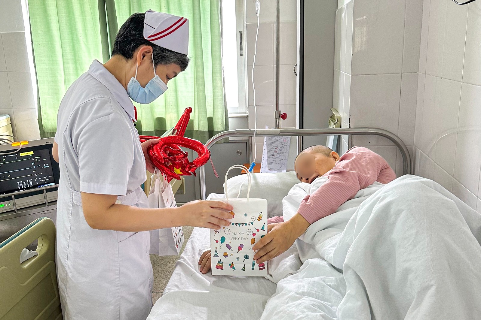 放疗一区的医务工作者还深入到临床病房,为一些行动不便的患者送上祝福,每到一间病房,暖小护们都会送上节日的祝福,详细询问患者的治疗、康复情况,鼓励他们安心养病,积极配合治疗,争取早日康复,与家人团聚。