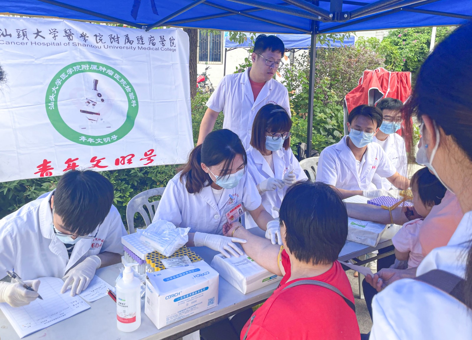 为贯彻广东省百校联百县助力“百县千镇万村高质量发展工程”行动(以下简称“双百行动”) ,帮扶南澳县深澳卫生院提高基层医务人员肿瘤防治知识,倡导老百姓健康生活方式,扎实推动“双百行动”落地落实,10月14日上午, 肿瘤专家团队赴南澳县深澳镇金山村开展大型送医送药大型义诊暨免费无痛胃镜筛查宣传活动。 本次活动由李嘉诚基金会汕头大学医学院公益办、 和第二附属医院联合举办,肿瘤医院头颈外科郭海鹏主任医师、放疗科伍方财副主任医师、营养科范鸣旭主治医师、许镒洧主任技师等14名医务人员参加活动。