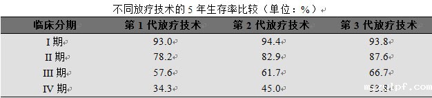 ![]() 注:表中数据为治愈率(5年生存率); 第1代放疗技术:1989年至1995年,60Co治疗,规则野照射,耳前野+前颈切线野; 第2代放疗技术:1996年至2001年,直线加速器或60Co治疗,传统二维模拟机模拟定位,面颈联合野+面颈分野配合电子线野照射 第3代放疗技术:2002年至2007年,病人三维CT模拟定位,治疗计划系统(TPS)设计放疗计划,即三维适形放疗计划(3D-CRT)