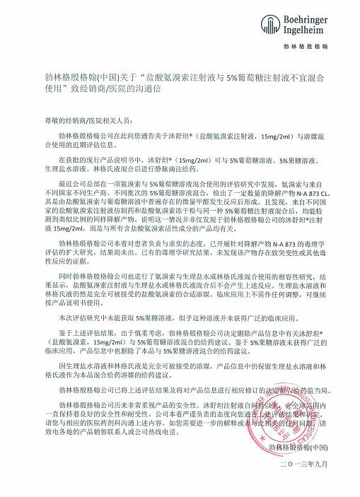 勃林格殷格翰(中国)关于“盐酸氨溴索注射液与5%葡萄糖注射液不宜混合使用”致经销商/医院的沟通信