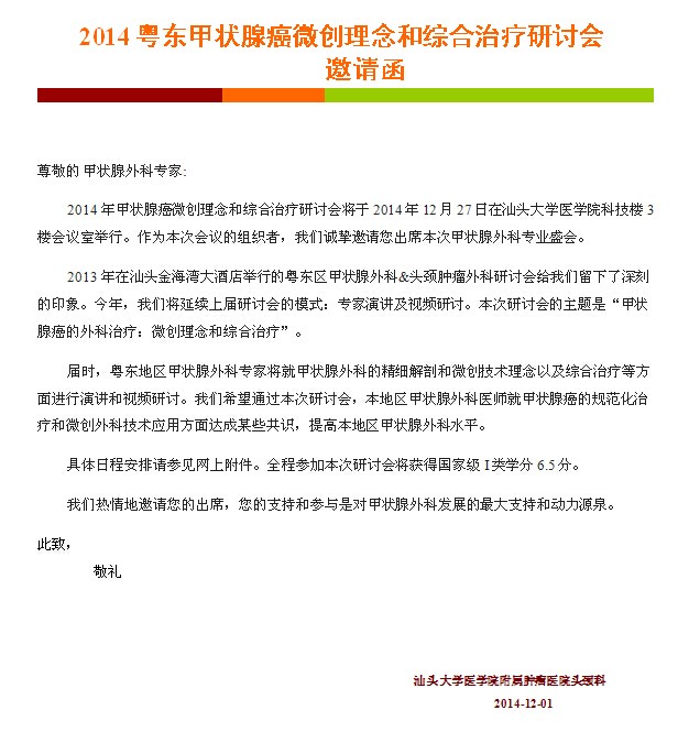 2014粤东甲状腺癌微创理念和综合治疗研讨会邀请函