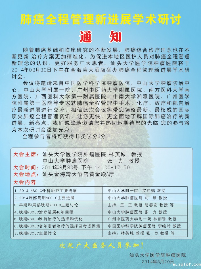 继续医学教育讲座:肺癌全程管理新进展学术研讨会通知