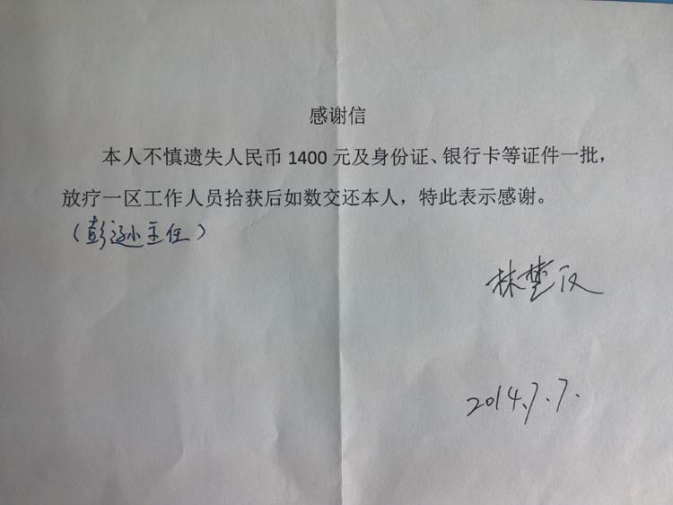 来自放疗一科的感谢信(2014-7-9纪检收到)
