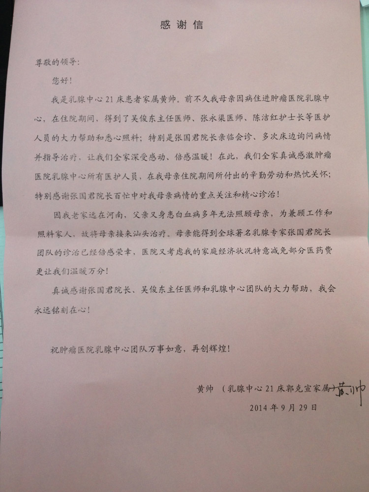 来自乳腺中心的感谢信(2014-9-30纪检收到)