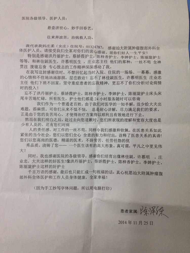 来自腹部外科的表扬信(2014-12-3纪检收到)