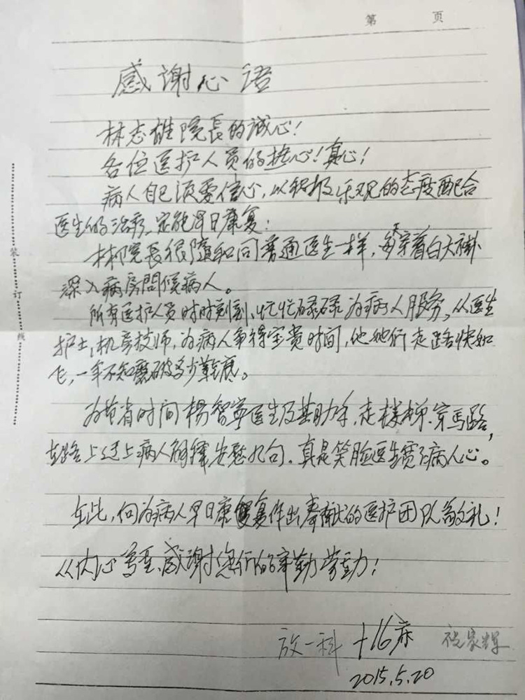来自放疗一科的感谢信(2015-5-22纪检收到)